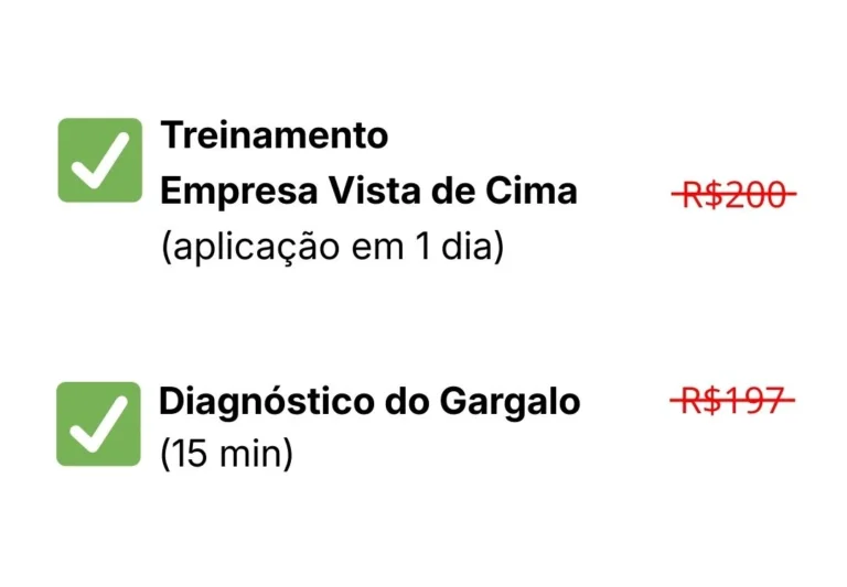 É um kit rápido de clareza (aulas curtas + mapas + aplicação prática) pra você enxergar sua empresa “por fora”, identificar o gargalo principal e sair com direção do que fazer em 1 dia.